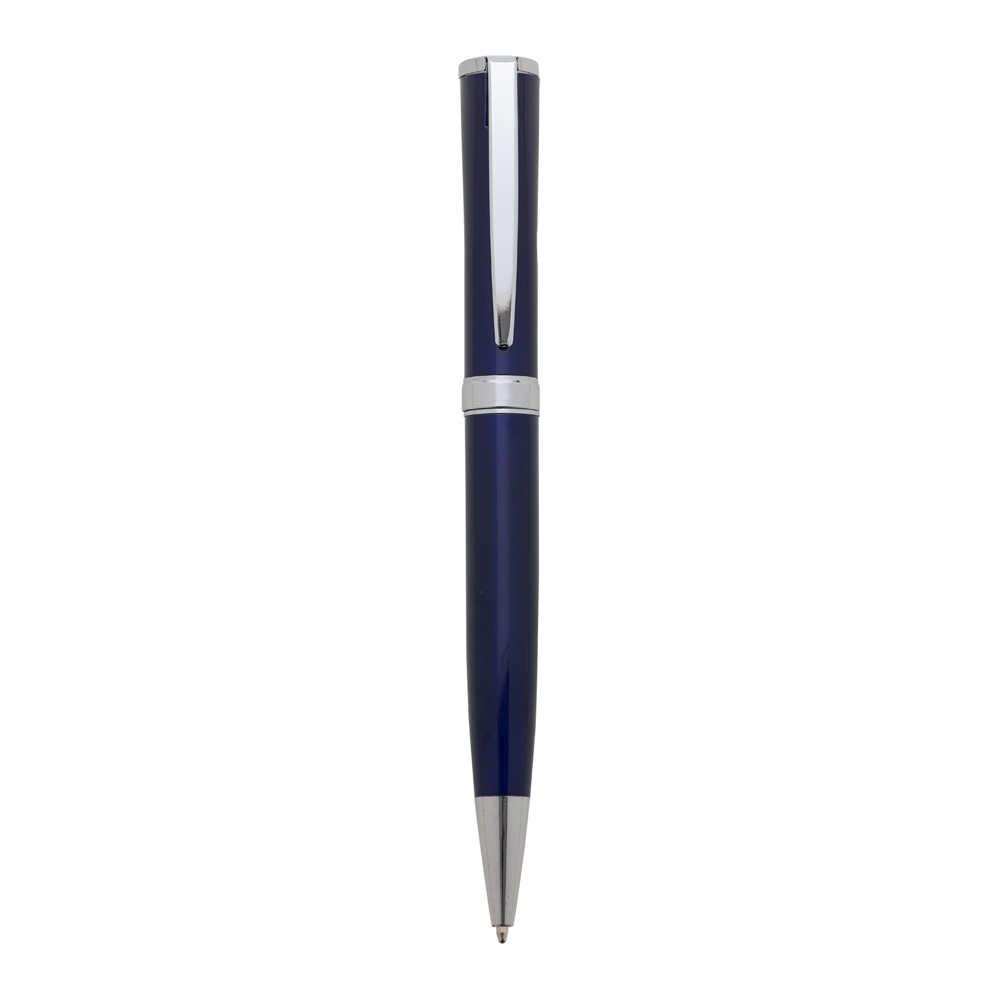 Descrição: Caneta metálica com carga esferográfica azul e acionamento por rotação.