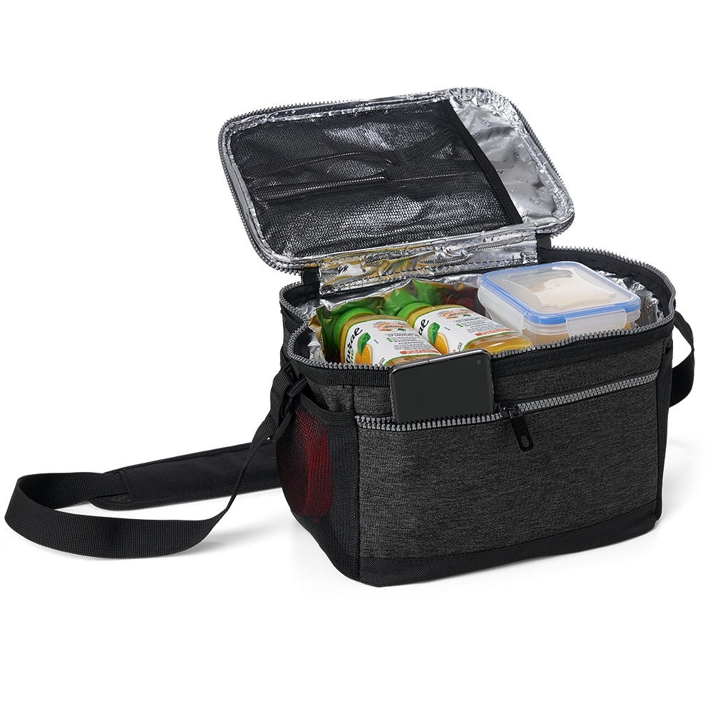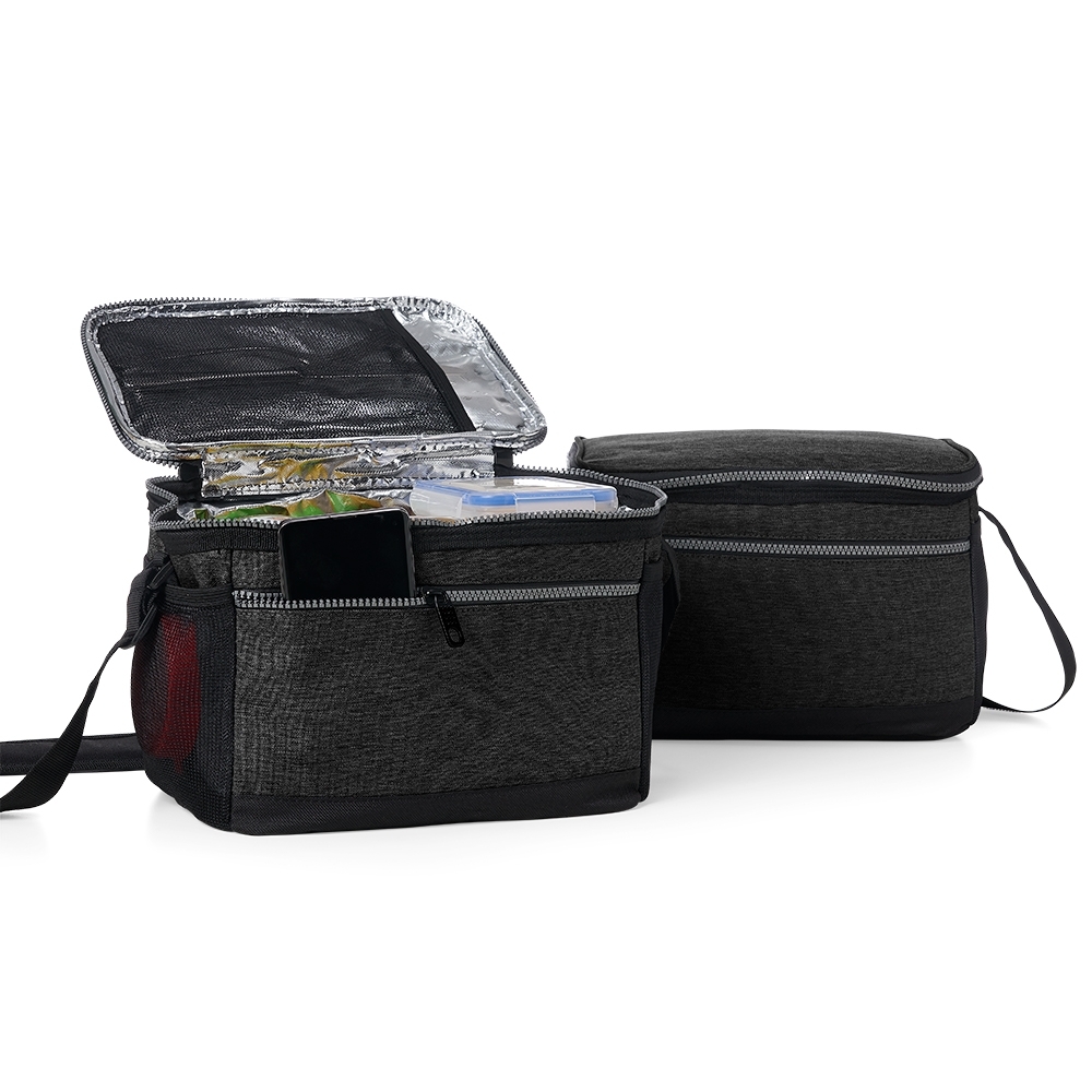 Descrição: Bolsa térmica de nylon 10 litros com dois compartimentos, sendo o principal com revestimento térmico e bolso telado para utensílios. Possui bolsos laterais em malha e alça transversal com apoio para ombro.