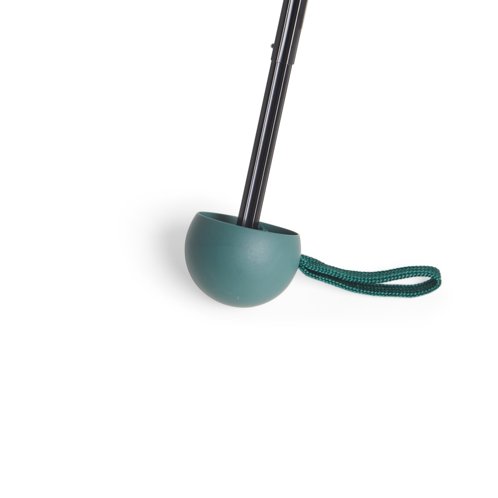 Descrição: Guarda-chuva manual cápsula em poliéster de impacto impermeável e proteção UPF 50. Possui tecido interno em vinil com 8 varetas e estrutura em aço, pegador, botão de abertura e e alça de Nylon. Acompanha estojo protetor com alça.