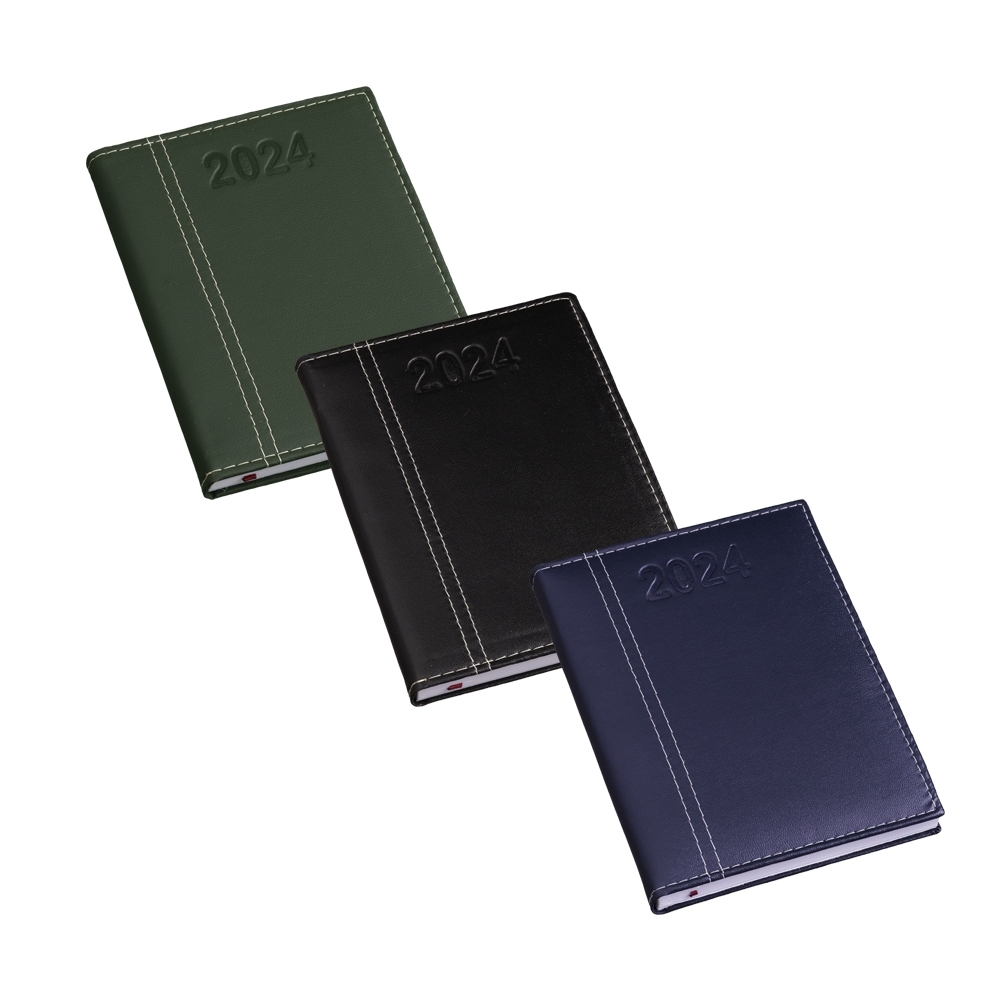 Descrição: Agenda diária 2024 de couro sintético. Contém fita de cetim marca página, dados pessoais, calendário de 2023 à 2025, mapa do Brasil, mapa-múndi, índice telefônico e planejamento. OBS.: PEDIDOS APENAS MÚLTIPLOS DE 10 PEÇAS!