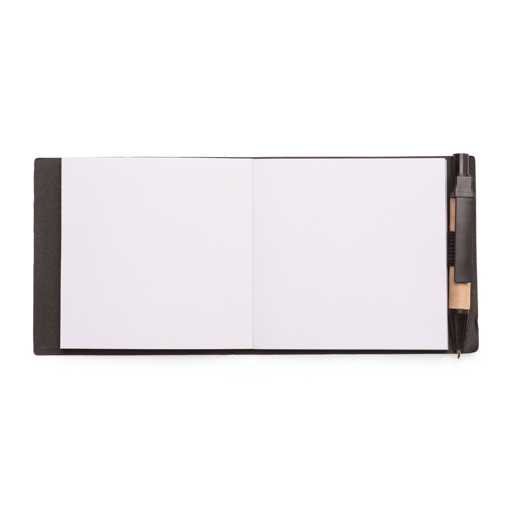 Descrição: Bloco ecológico(kraft) com autoadesivos e mini caneta. Possui cinco detalhes circulares vazados na parte inferior, caneta ecológica de papelão com clip e ponteira plástica. Bloco branco sem pauta com aproximadamente 100 folhas e cinco blocos autoadesivos coloridos com aproximadamente 20 folhas cada.