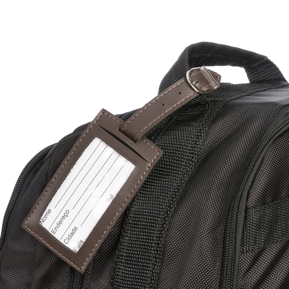 Descrição: Tag identificador de bagagem de couro sintético. Parte frontal com bolso de visor plástico e lado inverso liso, possui fivela prata com 3 tamanhos de encaixe.