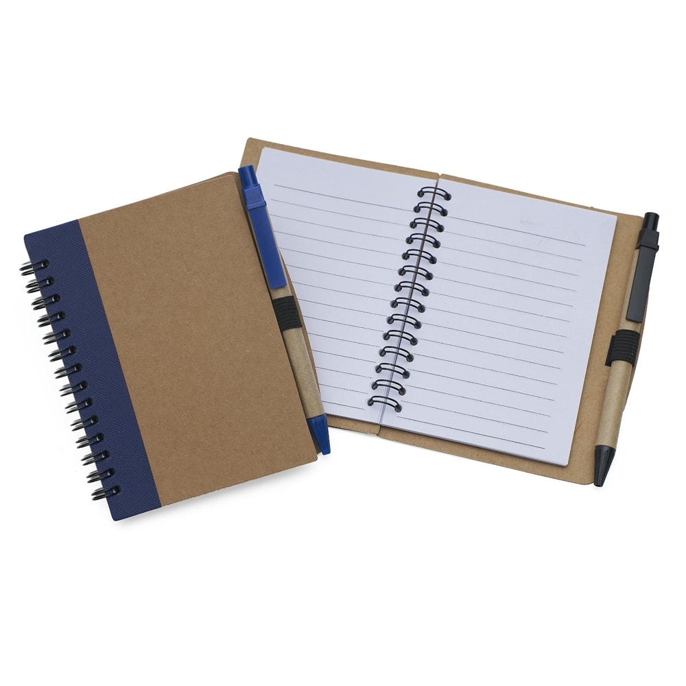 Descrição: Bloco de anotações ecológico com caneta, capa produzida em papelão com detalhe lateral texturizado e verso liso. Contém miolo com folhas pautadas, suporte de nylon e acompanha caneta de papelão com detalhes plásticos, carga esferográfica na cor azul e acionamento por clique.
