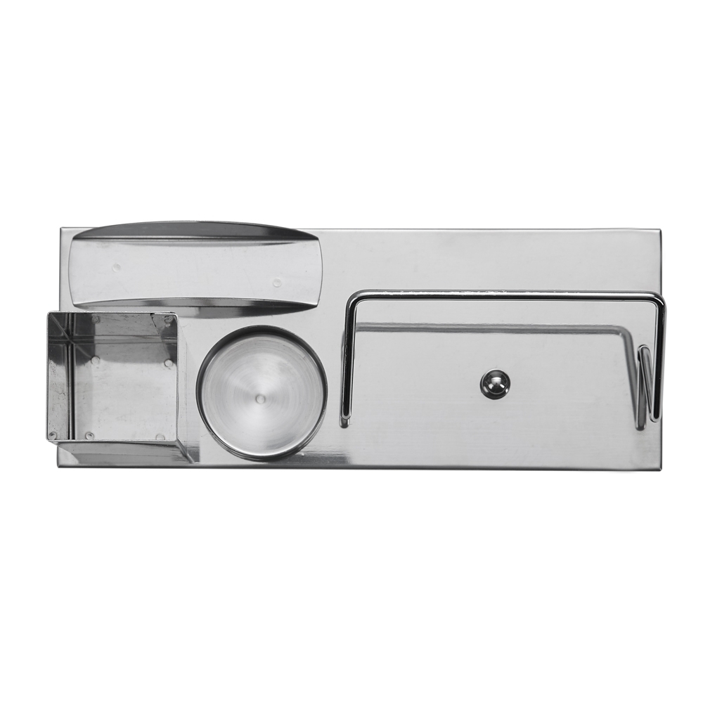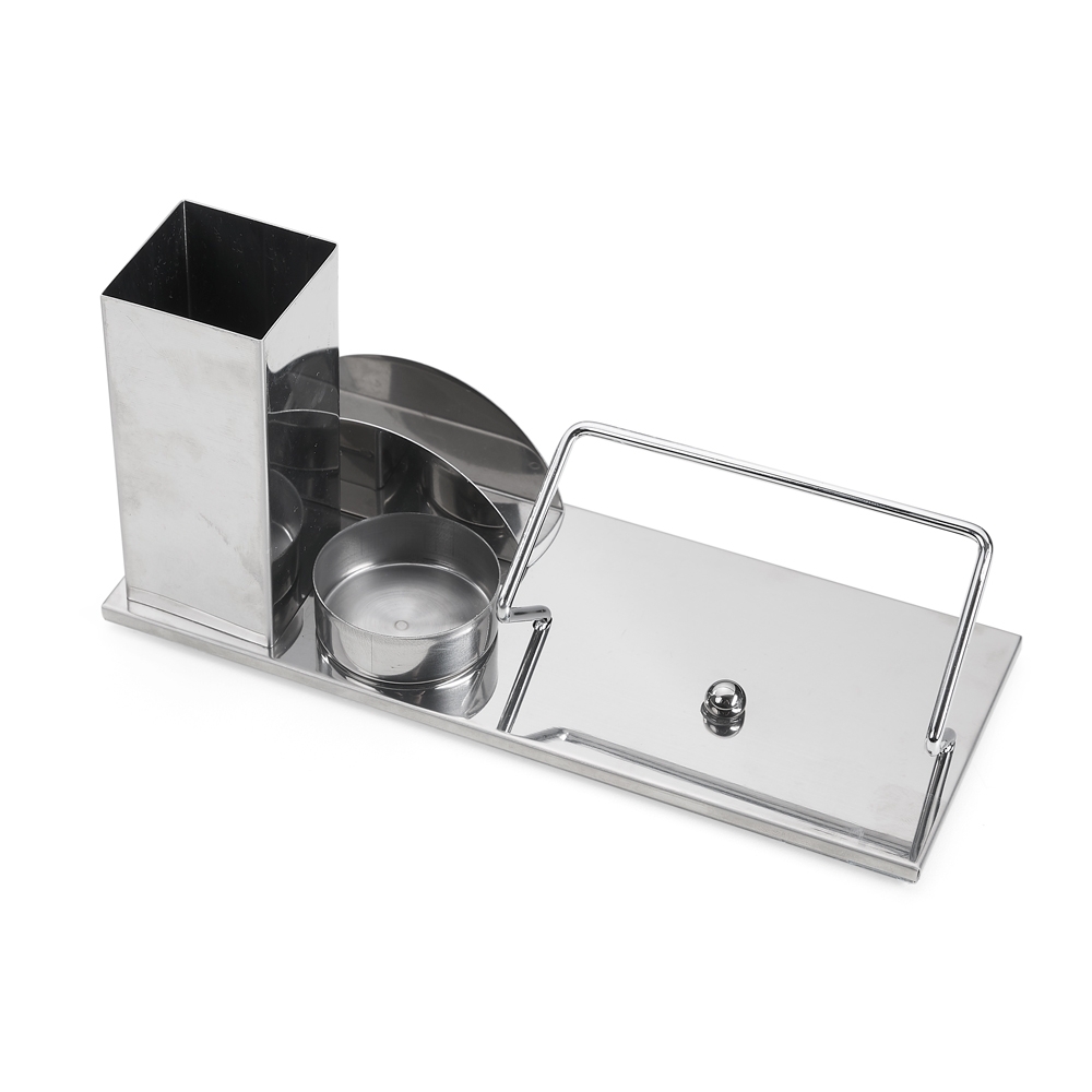 Descrição: Kit escritório 4 em 1. Material inox espelhado, suporte para cartões, canetas, clips e celular.