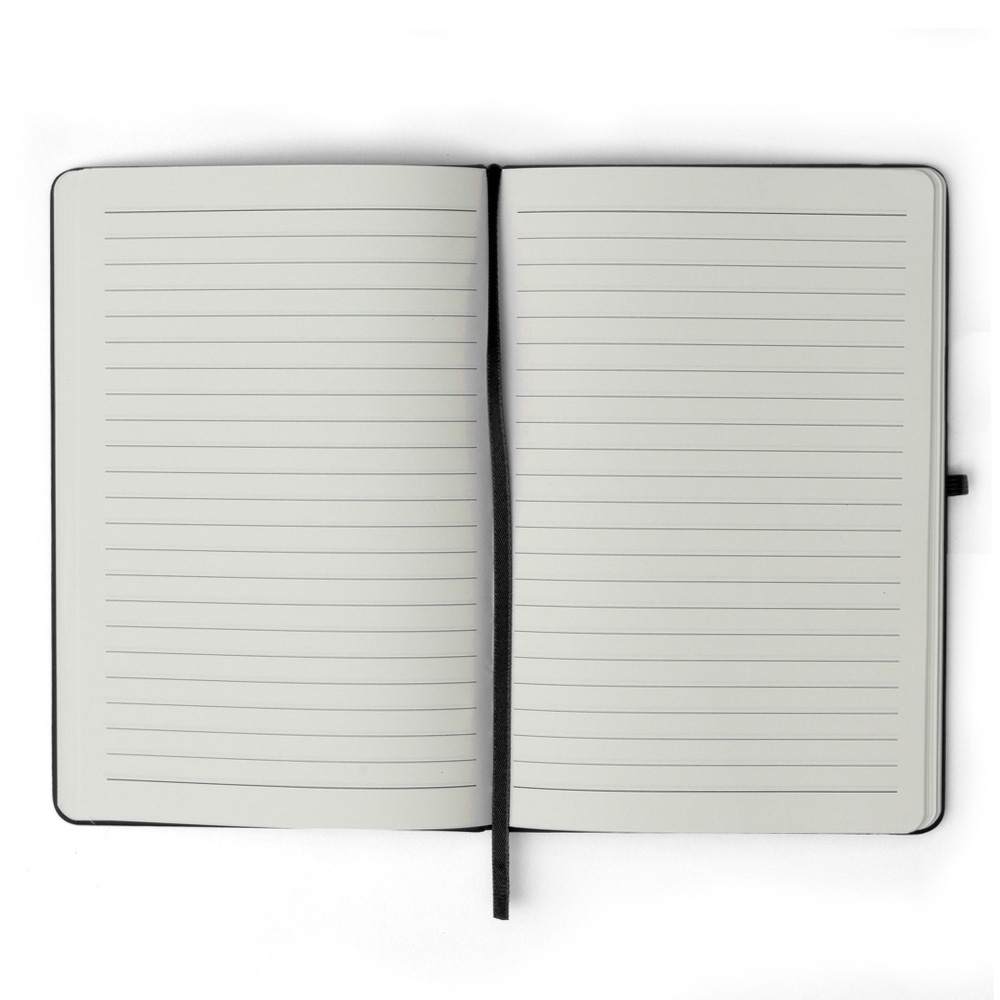 Descrição: Caderneta emborrachada com porta caneta elástico em nylon, marcador de página em cetim e fita elástica de nylon para fechar. Contém aproximadamente 80 folhas pardas pautadas.