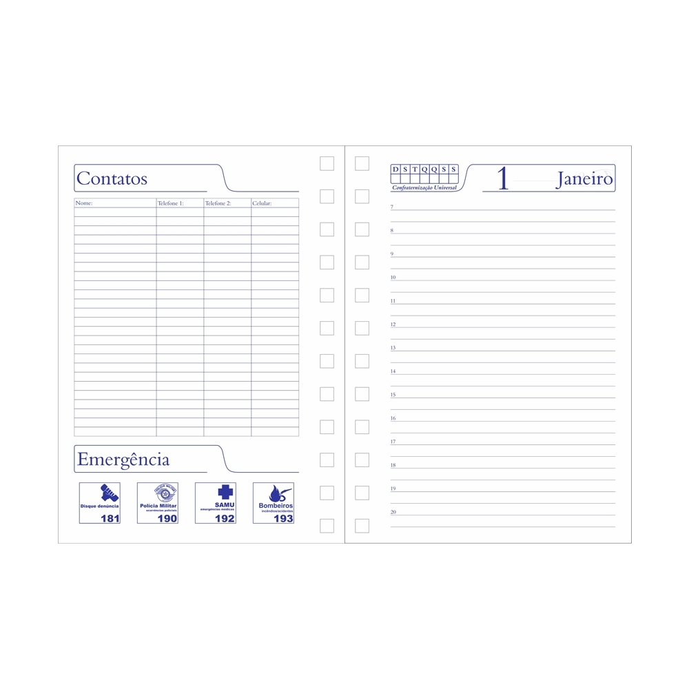 Descrição: Agenda compacta permanente com capa pet sublimática e wire-o pré-fechado. Possui aproximadamente 382 páginas, folha para dados pessoais, contatos e anotações. Informações do fornecedor para sublimação: temperatura 200ºC, tempo 25/30 segundos. OBS.: PEDIDOS APENAS MÚLTIPLOS DE 10 PEÇAS!