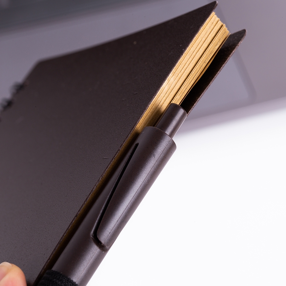Descrição: Bloco de anotações ecológico com caneta plástica: Bloco de anotações com elástico e suporte para caneta, produzido com grãos de café e polipropileno, aproximadamente 70 folhas marrons com pauta, caneta plástica com acionamento por clique.