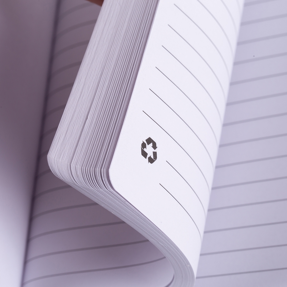 Descrição: Bloco de anotações ecológico com porta caneta: Bloco de anotações com suporte para caneta, produzido em couro reciclado, aproximadamente 80 folhas brancas com pauta.