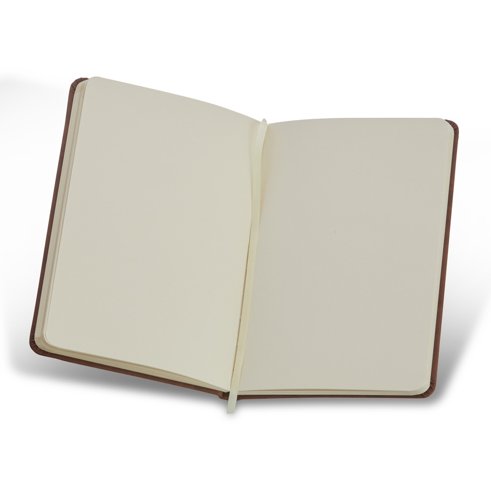 Descrição: Caderneta em couro sintético emborrachado, possui marca página em cetim e elástico para lacre. Contém aproximadamente 80 folhas marfim sem pauta.