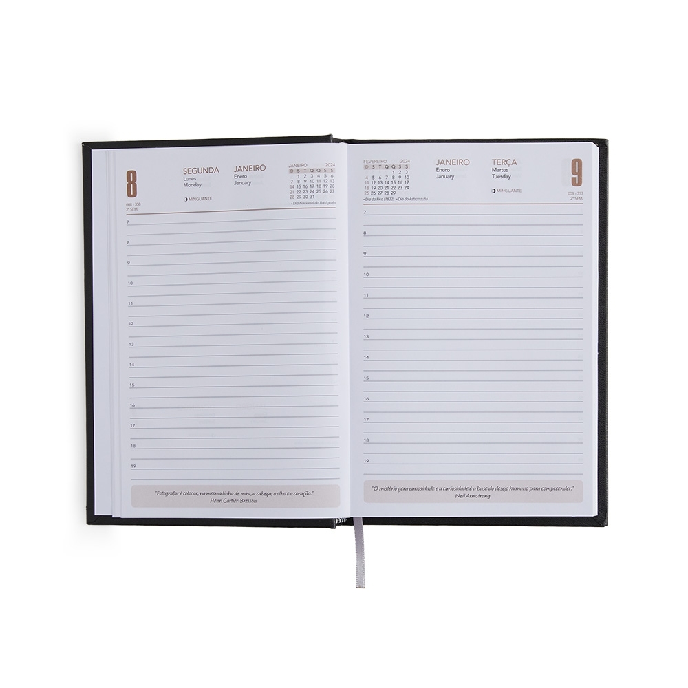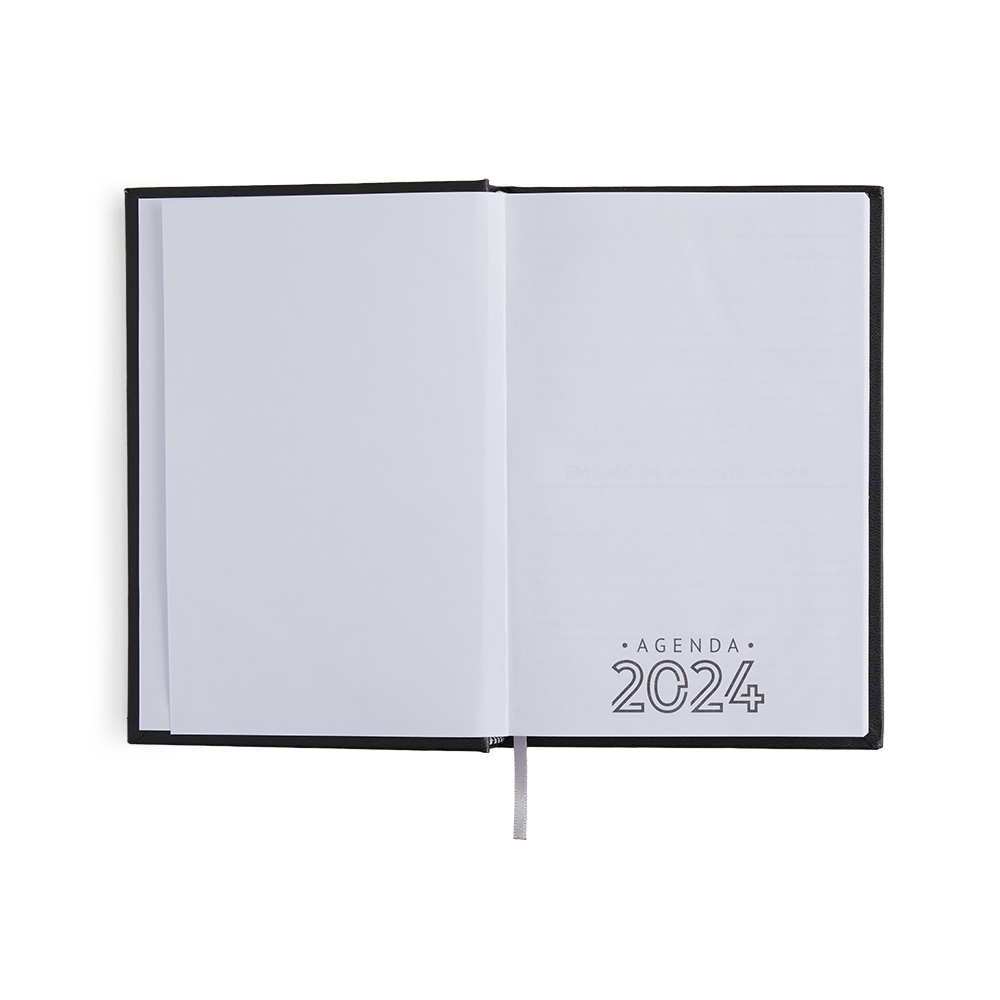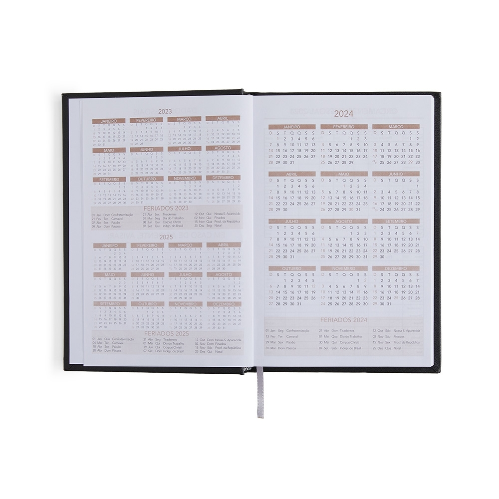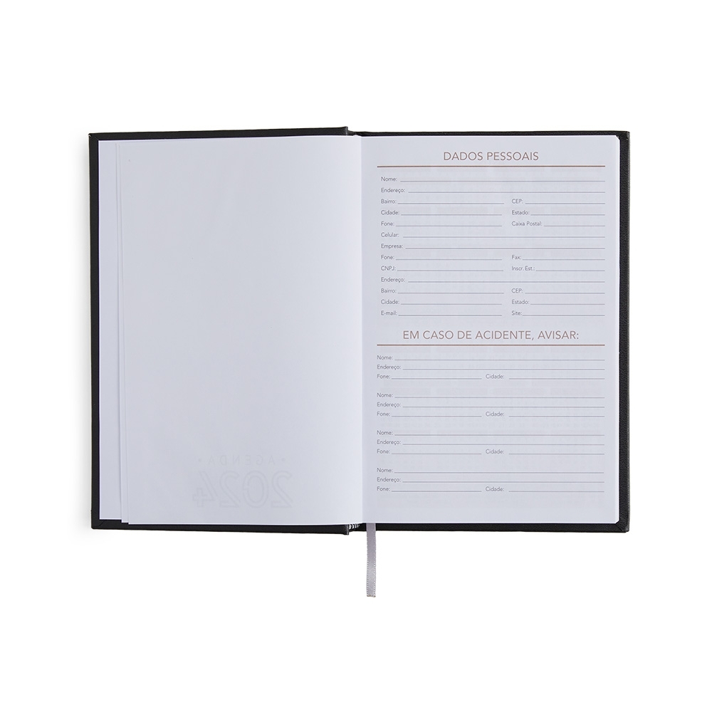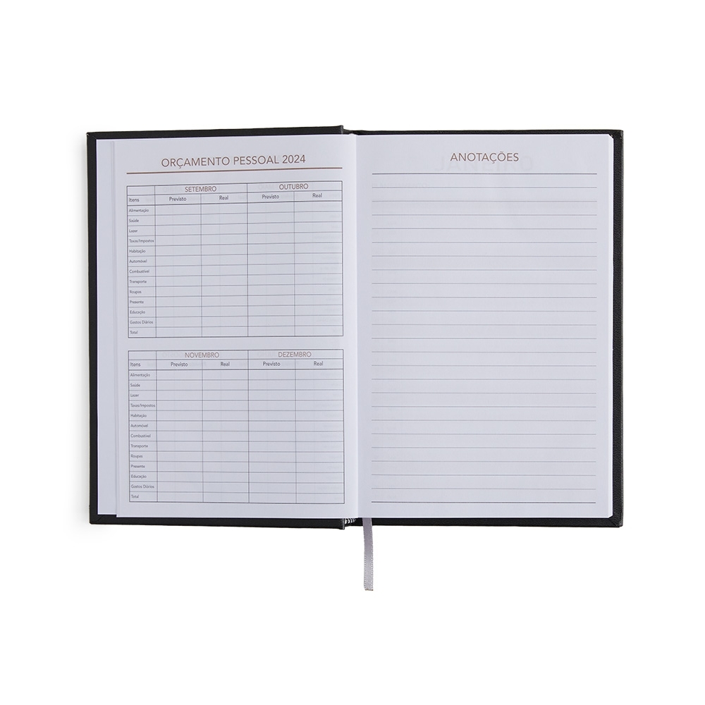 Descrição: Agenda 2024 com capa em cromato, contém páginas para dados pessoais, calendários de 2023 à 2025, orçamentos, anotações, planejamentos, endereços de contatos e mapas.