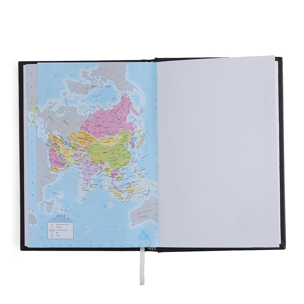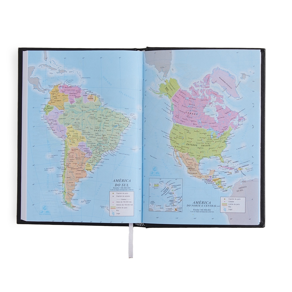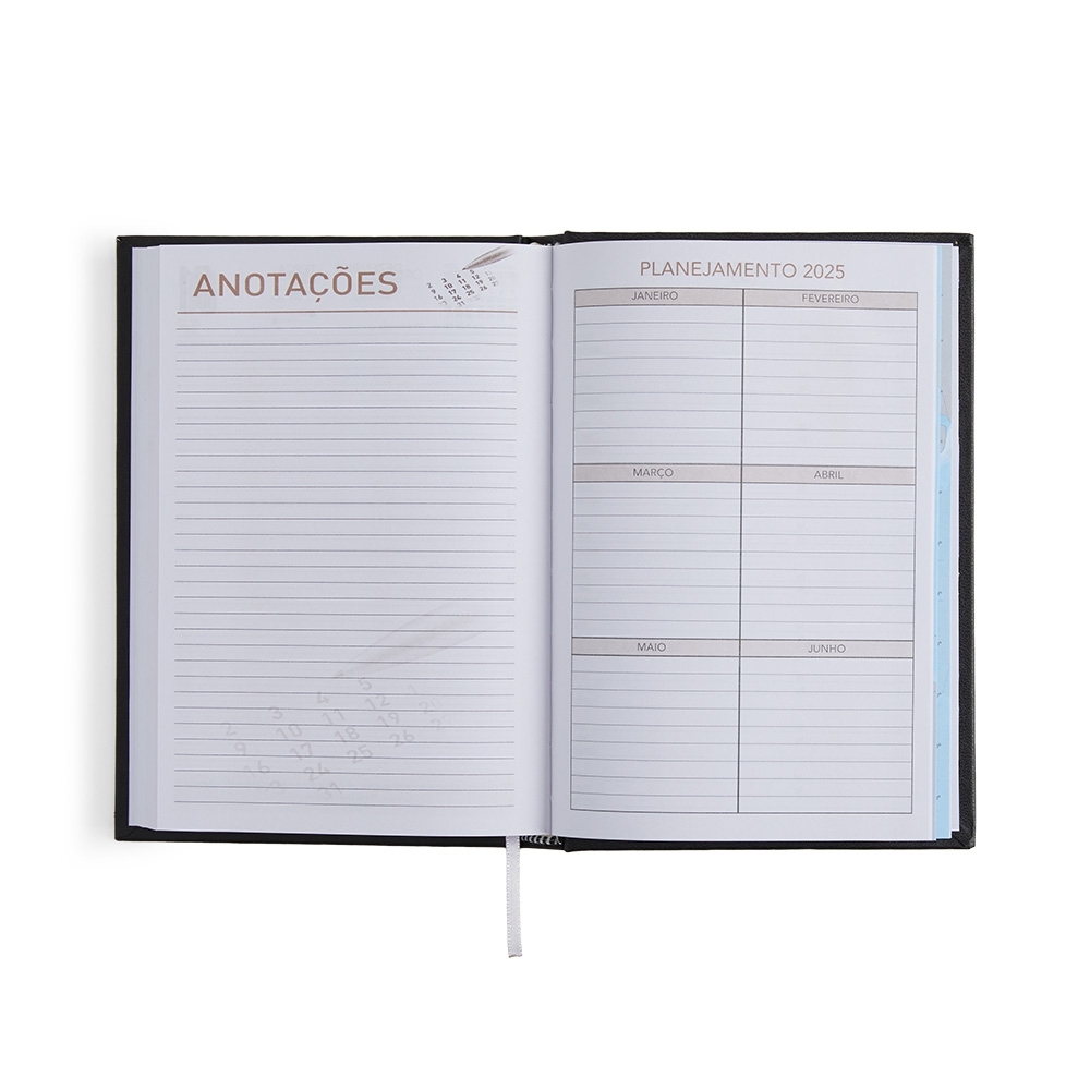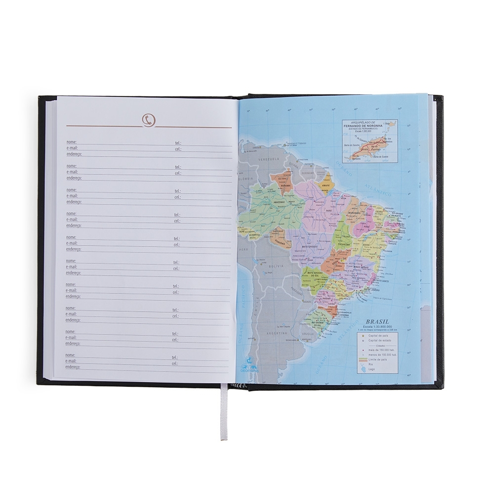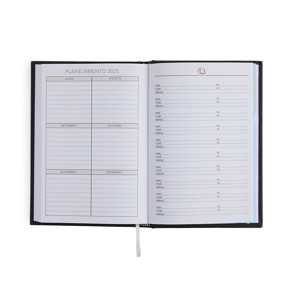Descrição: Agenda 2024 com capa em cromato, contém páginas para dados pessoais, calendários de 2023 à 2025, orçamentos, anotações, planejamentos, endereços de contatos e mapas.