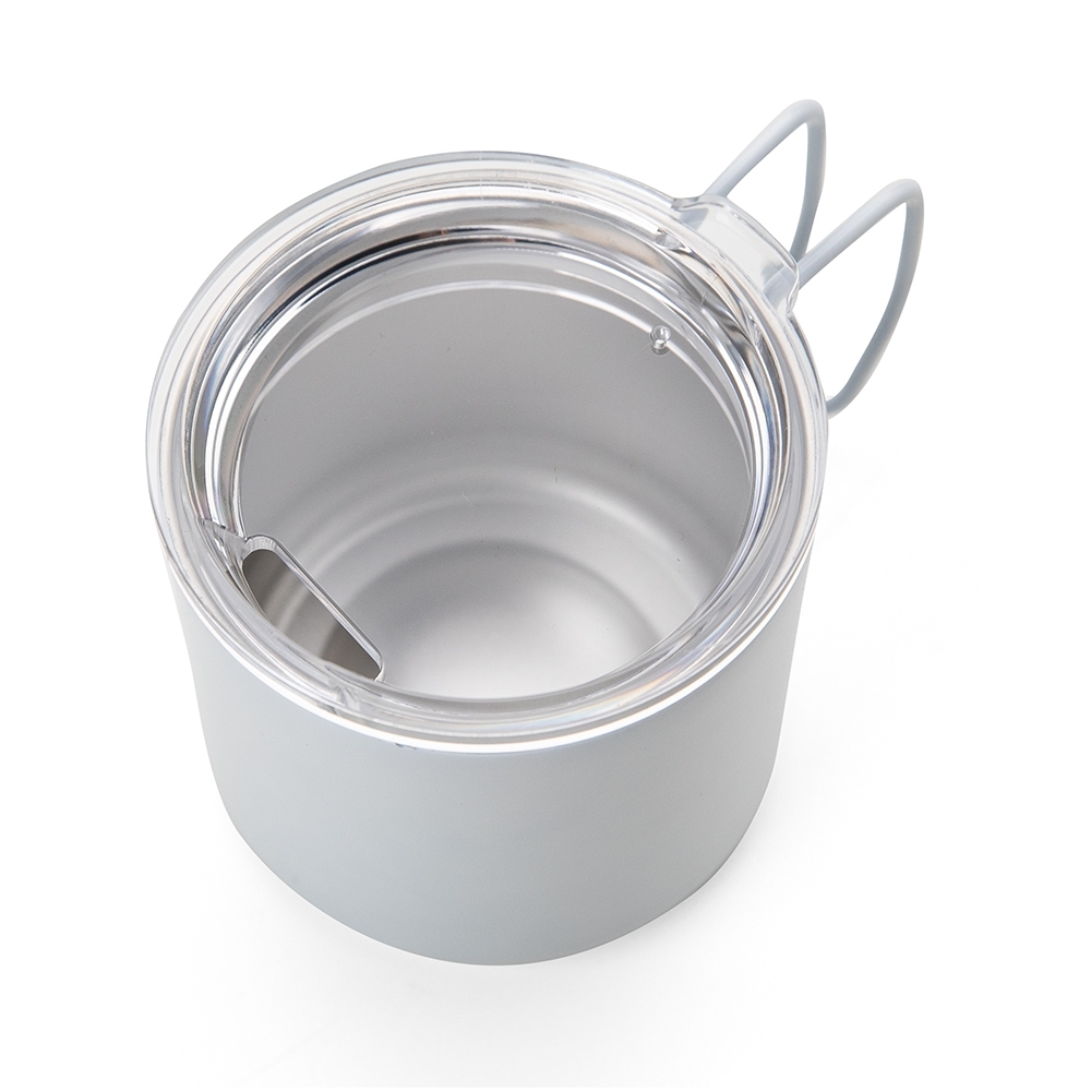Descrição: Caneca 350 ml parede dupla em Inox, com pegador de inox, contém tampa transparente com compartimento para beber.